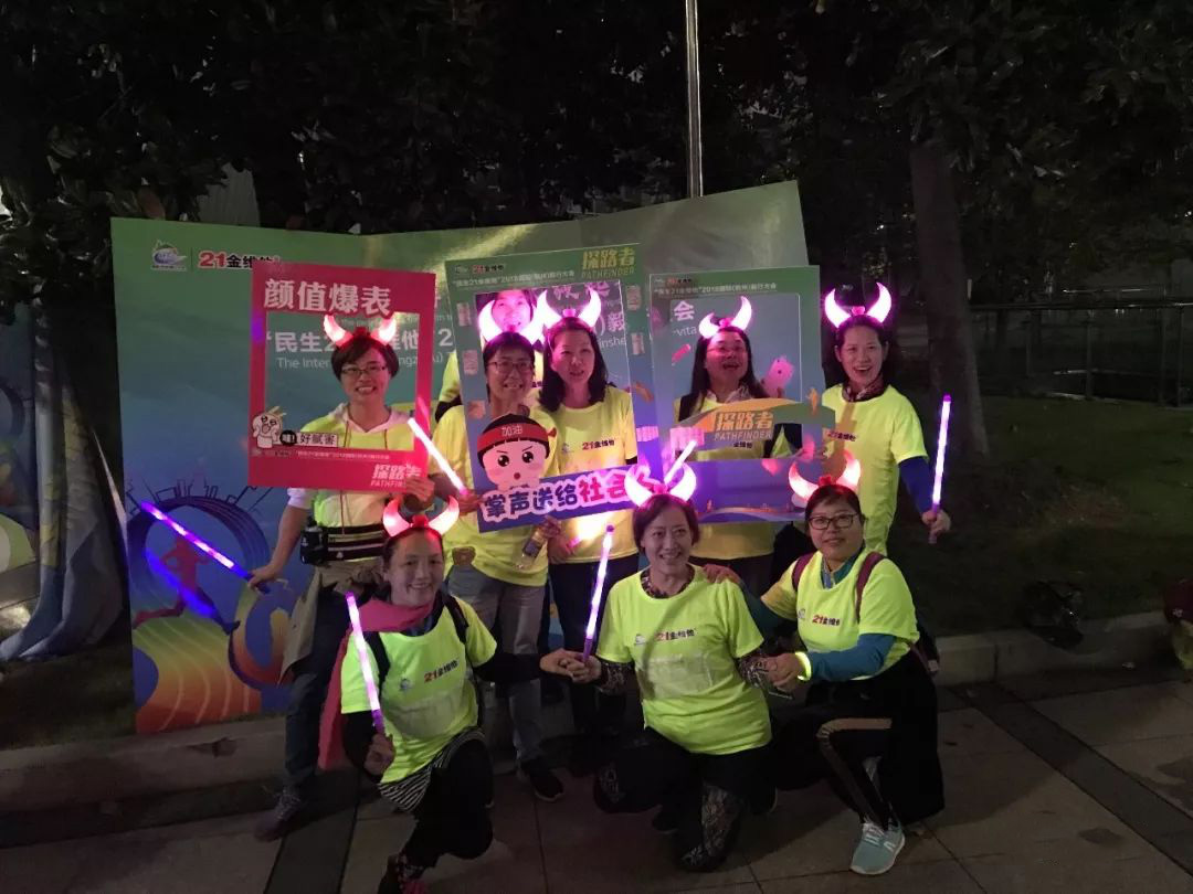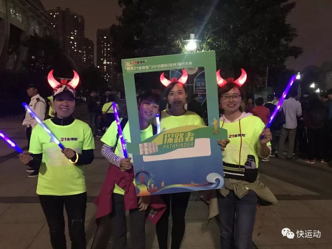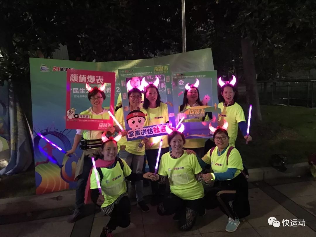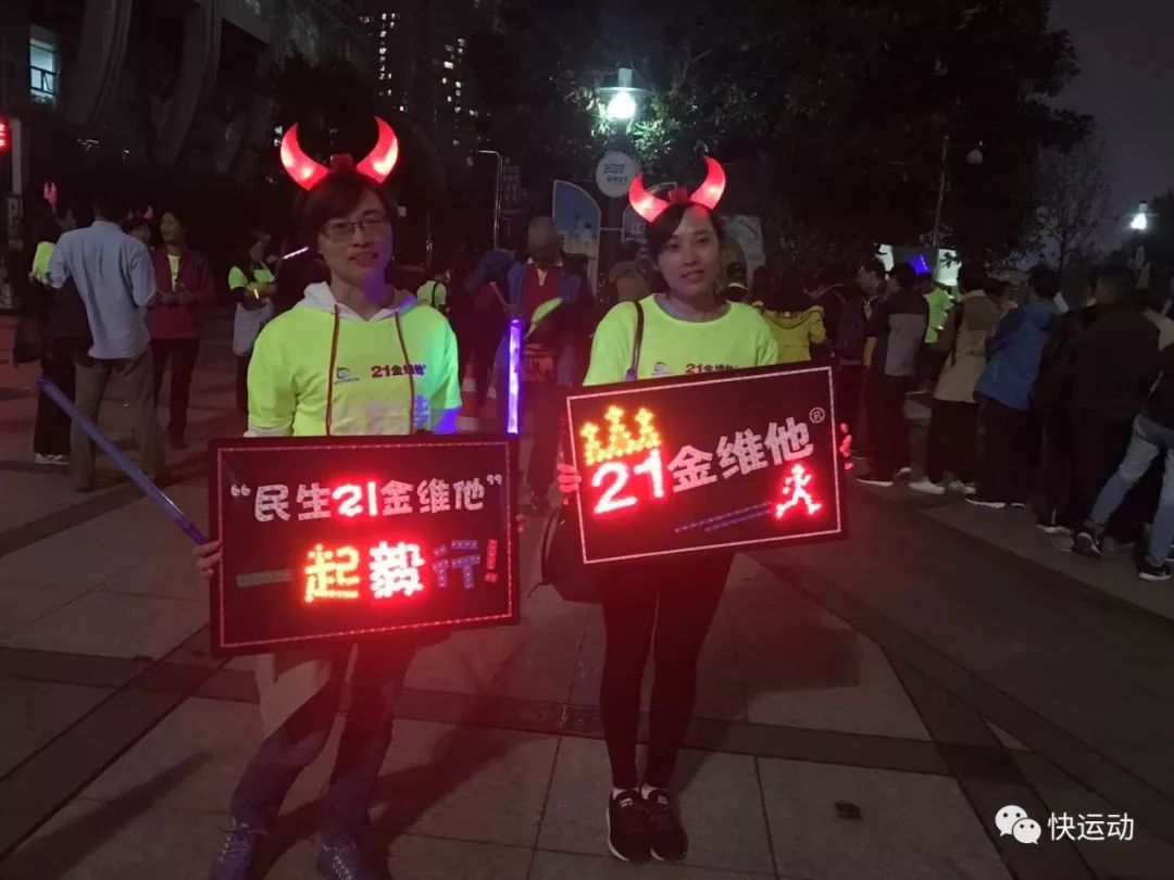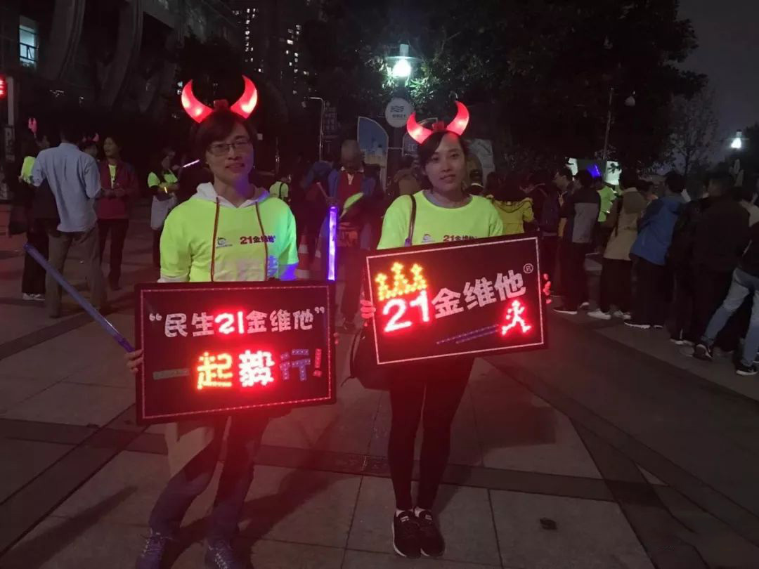 领到装备后,迅速套上身,有几个男生觉得戴粉色头灯有点害羞,特意换了蓝色的手环,和妹子们开心合影。“民生21金维他”的发光字灯牌、合影框以及探路者的大背景板,都成了大家拍照的工具。