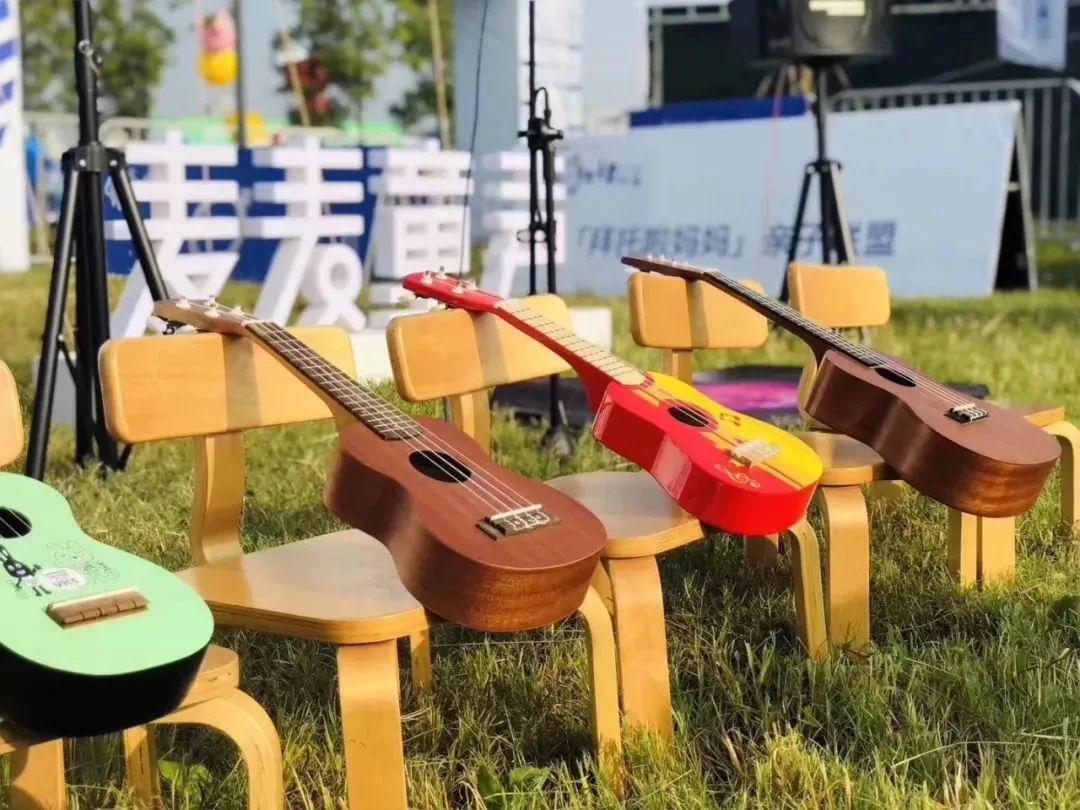 家长带着孩子一起玩棒球,橄榄球,滑步车等多项运动