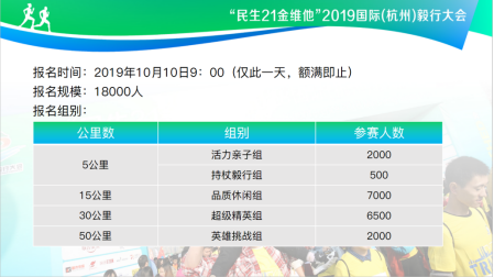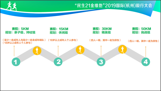 活动品牌的打造与传承,价值的提升与发展,都离不开知名企业的共同助力。民生医药自2016年开始连续冠名国际(杭州)毅行大会,今年已是第四个年头,四年携手相伴,民生21金维他与杭州毅行大会互相促进、共同发展。民生医药继续推出民生集团的拳头产品“21金维他”冠名本届国际(杭州)毅行大会,在继续发挥企业力量和社会责任,推动健康和运动成为全民潮流的同时,也希望通过这项活动和越来越多热爱运动的消费者建立起沟通的桥梁,全力支持全民健身更好发展,并与组委会携手合作,共同为大家奉献一届精彩的国际(杭州)毅行大会。