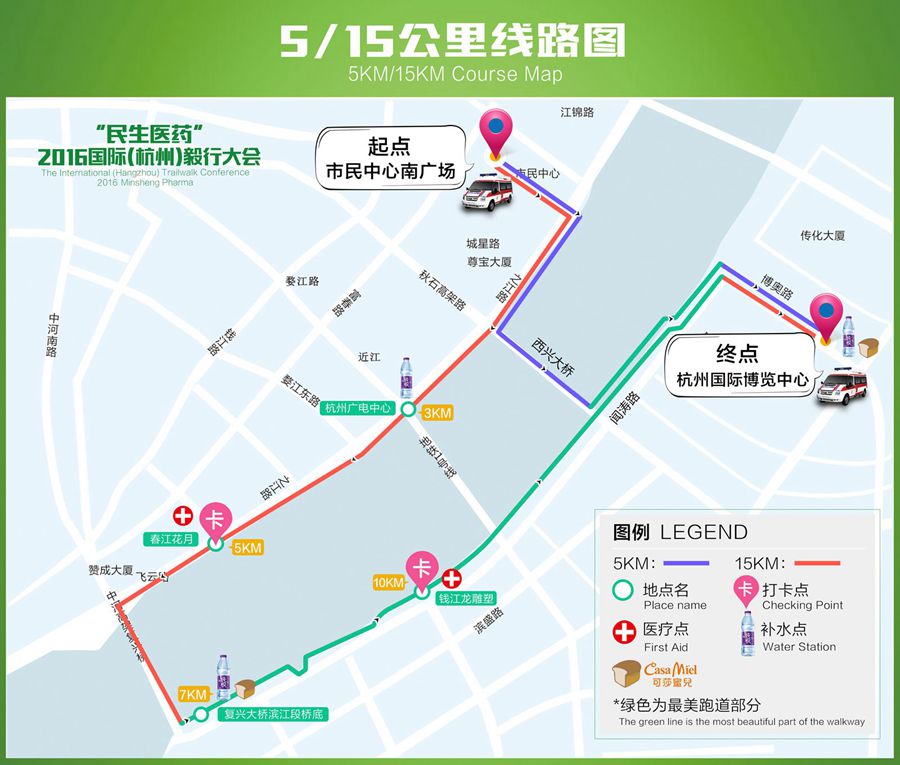 15公里:市民中心南广场→之江路与婺江路交叉口→春江花月→复兴大桥滨江段桥底→钱江龙雕塑→杭州国际博览中心