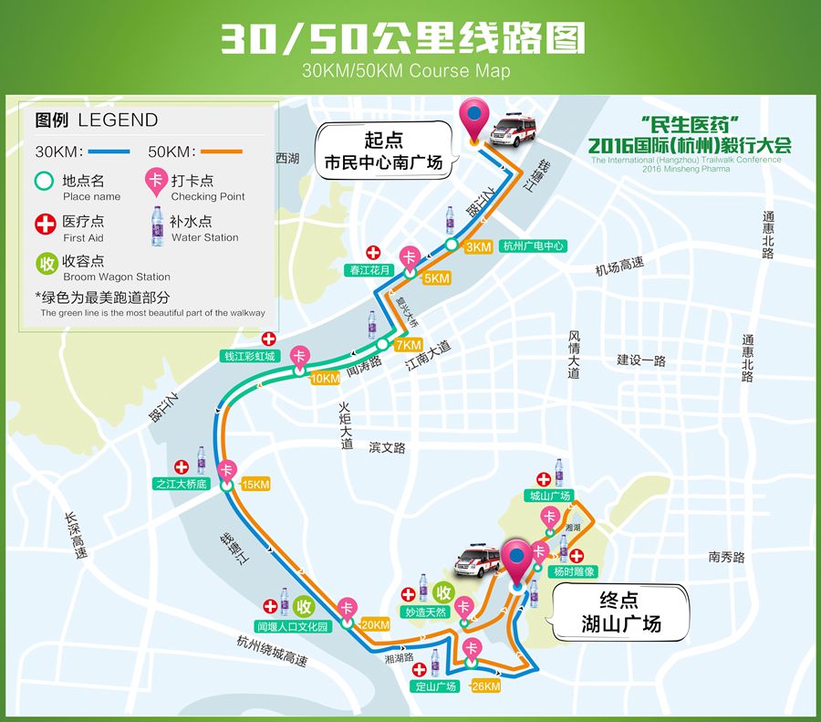 30/50公里:市民中心南广场→杭州广电中心→春江花月→飞江路→复兴大桥→复兴大桥滨江段桥底→钱江彩虹城→之江大桥底→闻堰人口文化园→定山广场→(30公里终点:湖山广场)→杨时雕像→城山广场→妙造天然牌坊→湖山广场(50公里终点)